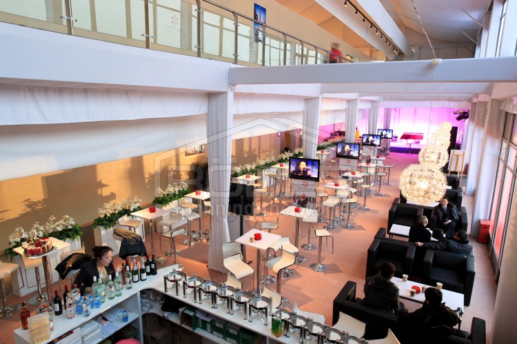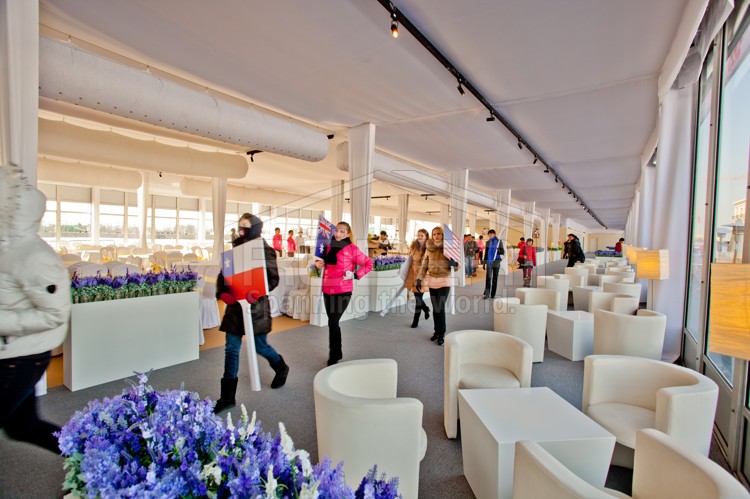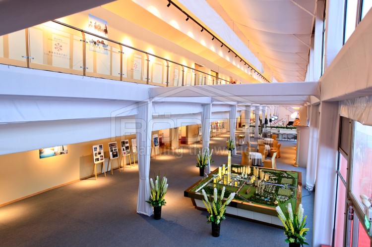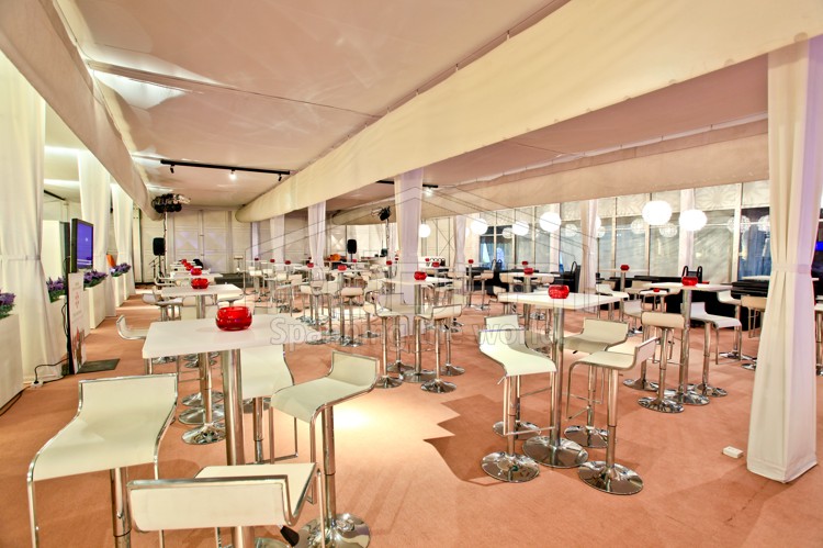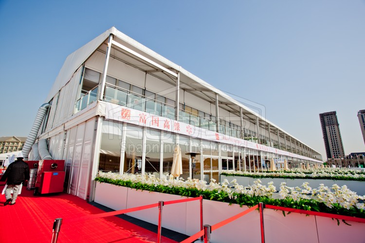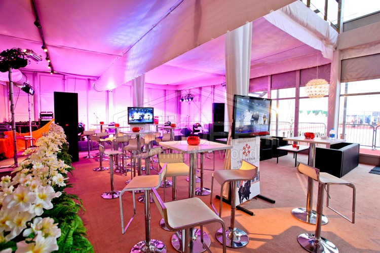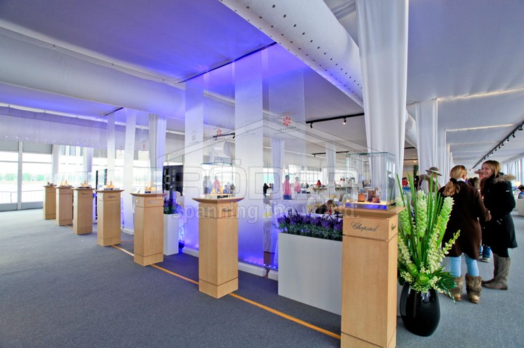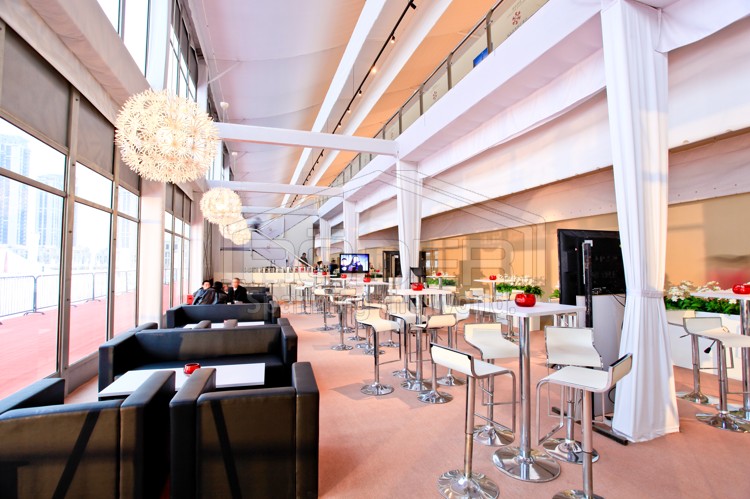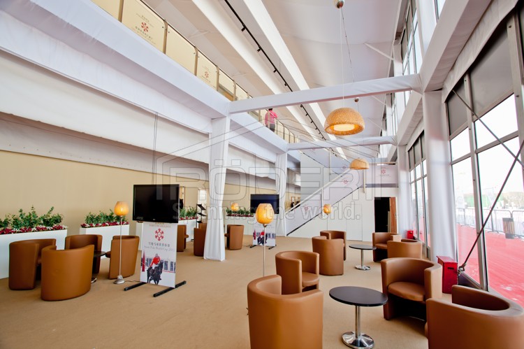 RODER使用兩座雙層結構20X120m篷房,球形篷房,solution平頂篷房,各種篷房等和樓梯,平臺,各類家具,內部裝飾等,為賽事設計和建筑了場地上所有室外建筑和室內活動設施。包括:觀賽席,餐廳,休息室,會議廳VIP室,售票廳,展示廳,媒體接待廳等??偢采w面積12570平方米。